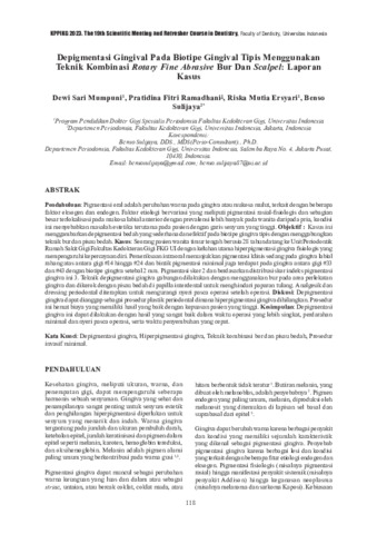 Dewi, Sari Mumpuni and Pratidina, Fitri Ramadhani and Riska, Mutia Ersyari and Benso, Sulijaya (2023) Depigmentasi gingival pada biotipe gingival tipis menggunakan teknik kombinasi rotary fine abrasive bur dan scalpel: laporan kasus. In: Prosiding KPPIKG 2023: The 19th Scientific Meeting and Refresher Coursein Dentistry, Faculty of Dentistry, Universitas Indonesia, 2-4 Februari 2023, Jakarta Convention Center.