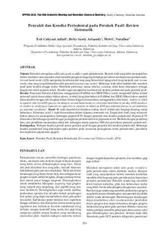Esti, Cahyani Adiati and Deby, Santy Arisandy and Meivi, Meivi and Natalina, Natalina (2023) Penyakit dan kondisi periodontal pada perokok pasif: review sistematik. In: Prosiding KPPIKG 2023: The 19th Scientific Meeting and Refresher Coursein Dentistry, Faculty of Dentistry, Universitas Indonesia, 2-4 Februari 2023, Jakarta Convention Center.