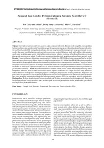 Tujuan: Merokok merupakan salah satu grade modifiers pada periodontitis. Banyak studi yang telah menunjukkan bahwa tembakau atau merokok aktif memiliki pengaruh langsung terhadap prevalensi dan keparahan periodontitis.Second-hand smoke (SHS) merupakan kombinasi dari asap yang berasal dari ujung rokok yang menyala (side stream smoke) dan asap yang dikeluarkan oleh perokok (mainstream smoke). Beberapa studi telah melihat efek merokok pasif pada kondisi rongga mulut. Metabolit proksimat utama nikotin, cotinine, telah lama diterapkan sebagai diagnostik untuk paparan rokok. Penulis ingin mengetahui karakteristik kondisi periodontal pada perokok pasif.Desain: Pencarian literatur dilakukan menggunakan PubMed dan EBSCOHost untuk mengambil daftar artikel potensial untuk dimasukkan dalam ulasan. Artikel yang diterbitkan di PubMed dan EBSCOHost dalam sepuluh tahun terakhir dengan teks lengkap dalam bahasa Inggris dimasukkan, menggunakan kata kunci “(adults or adult or aged or elderly) AND (passive smoking or second hand smoke or environmental tobacco smoke) AND (smokers or smoker or smoking or cigarette or cigarettes or nicotine or tobacco) AND (periodontal disease or periodontitis periodontal condition)”. Hasil: 49 studi diambil dari database online, dan 9 artikel teks lengkap disaring untuk kelayakan. Akhirnya, total 5 studi dimasukkan dalam tinjauan sistematis ini. Empat dari studi yang termasuk dalam ulasan ini menunjukkan hubungan paparan ETS dengan penyakit atau kondisi periodontal. Paparan ETS ditemukan berhubungan positif dengan peningkatan periodontitis dan pigmentasi oral. Berbeda dengan penelitian lain, satu penelitian menemukan tidak ada hubungan antara paparan SHS dan prevalensi penyakit periodontal.Kesimpulan: Terdapat korelasi positif antara perokok pasif dengan penyakit dan kondisi periodontal. Beberapa kondisi periodontal yang ditemukan pada perokok pasif, termasuk peningkatan risiko periodontitis, prevalensi dan keparahan pigmentasi gingiva.