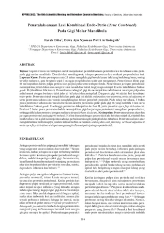 Farah, Diba and Dewa, Ayu Nyoman Putri Artiningsih (2023) Penatalaksanaan lesi kombinasi endo-perio (true combined) pada gigi molar mandibula. In: Prosiding KPPIKG 2023: The 19th Scientific Meeting and Refresher Coursein Dentistry, Faculty of Dentistry, Universitas Indonesia, 2-4 Februari 2023, Jakarta Convention Center.