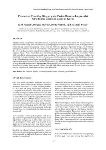 Tujuan: Setiap orang berhak memiliki senyum yang indah karena senyuman adalah hal yang pertama kali diperhatikan oleh orang. Salah satu elemen yang mempengaruhi keindahan senyuman adalah posisi gigi anterior.Malposisi gigi anterior mengurangi estetika senyum. Malposisi gigi dapat diperbaiki dengan alat ortodonti.Sayangnya, perawatan ortodonti membutuhkan biaya yang besar. Pada kasus crowding ringan hingga sedang, alat ortodonti lepasan dapat menjadi alternatif perawatan yang menjanjikan untuk mengoreksi malposisi gigi.Laporan Kasus: Pasien wanita Indonesia usia 21 tahun datang dengan keluhan gigi depan berantakan. Pasien tidak memiliki keluhan umum dan dental yang signifikan. Pasien memiliki profil lurus, hubungan skelatal dan dental kelas I dengan maloklusi tipe I crowding anterior disertai diastema, hubungan molar dan kaninus kelas I.Pasien diberikan perawatan berupa alat ortodonti lepasan yang terdiri dari labial bow dikombinasikan dengan pegas sederhana dan bumper terbuka. Setelah 8 bulan perawatan, keluhan utama berhasil diatasi, crowding anterior terkoreksi dan diastema tertutup. Kesimpulan: Alat ortodonti lepasan yang didukung oleh kepatuhan pasien dan kontrol rutin berkala, dapat menjadi pilihan alternatif baik dalam mengatasi pasien dewasa dengan crowding anterior ringan untuk mendapatkan senyum yang lebih baik.