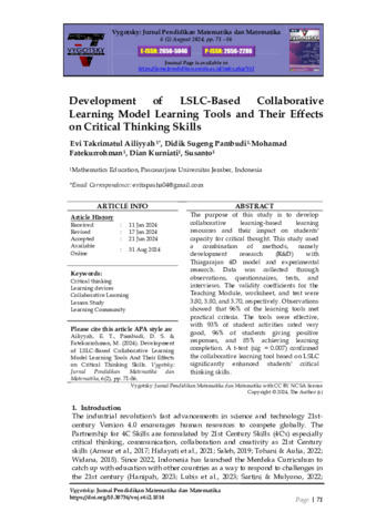 Evi, Takrimatul Ailiyyah and Mohamad, Fatekurrohman and Didik, Sugeng Pambudi and Dian, Kurniati and Susanto, Susanto (2024) Development of LSLC-based collaborative learning model learning tools and their effects on critical thinking skills. Vygotsky: Jurnal Pendidikan Matematika dan Matematika, 6 (2): 1. 71-86.. ISSN 2656-2286