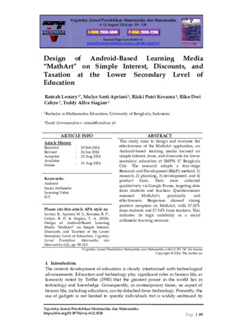 Ratnah, Lestary and Mulya, Sarti Apriani and Rizki, Putri Kesuma and Riko Dwi, Dwi Cahyo and Teddy, Alfra Siagian (2024) Design of android-based learning media “mathart” on simple interest, discounts, and taxation at the lower secondary level of education. Vygotsky: Jurnal Pendidikan Matematika dan Matematika, 6 (2): 3. pp. 99-110. ISSN 2656-2286