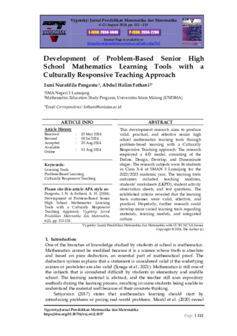 Ismi, Nurafdila Pangestu and Abdul, Halim Fathani (2024) Development of problem-based senior high school mathematics learning tools with a culturally responsive teaching approach. Vygotsky: Jurnal Pendidikan Matematika dan Matematika, 6 (2): 4. pp. 111-118. ISSN 2656-2286
