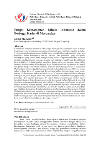 Mitha, Murniati (2024) Fungsi kemampuan bahasa Indonesia dalam berbagai karier di masyarakat. Publikasi Ilmiah: Jurnal Publikasi Ilmiah, 2 (3): 5. pp. 33-39. ISSN 3031-0490