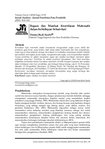 Darma, Budi Susilo (2024) Ragam dan manfaat kecerdasan matematis dalam kehidupan sehari-hari. Jurnal Analisis: Jurnal Penelitian Para Pendidik, 2 (3): 5. pp. 33-39. ISSN 3031-1225