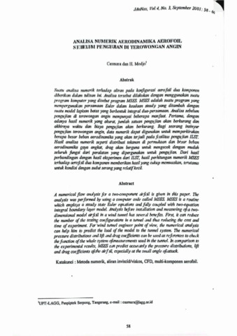 Suatu analisa numerik terhadap aliran pada konfigurasi aerofoil dua komponen diberikan dalam tulisan ini. Analisa tersebut dilakukan dengan menggunakan suatu program komputer yang disebut program MSES. MSES adalah suatu program yang mempergunakan persamaan Euler dalam keadaan steady yang ditambah dengan suatu model lapisan batas yang berbentuk integral dua-persamaan. Analisa sebelum pengujian di terowongan angin mempunyai beberapa manfaat. Pertama, dengan adanya hasil numerik yang akurat, jumlah satuan pengujian akan berkurang dan akhirnya waktu dan biaya pengujian akan berkurang. Bagi seorang insinyur pengujian terowongan angin, data numerik dapat digunakan untuk memperkirakan berapa besar beban aerodinamika yang akan terjadi pada fasilitas pengujian ILST. Hasil analisa numerik seperti distribusi tekanan di permukaan dan besar beban aerodinamika gaya angkat, drag akan berguna untuk mengecek dengan mudah seluruh fungsi dari peralatan yang dipergunakan untuk pengujian. Dari hasil perbandingan dengan hasil eksperimen dari ILST, hasil perhitungan numerik MSES terhadap aerofoil dua komponen memberikan hasil yang cukup memuaskan, terutama untuk kondisi dengan sudut serang yang relatif kecil.