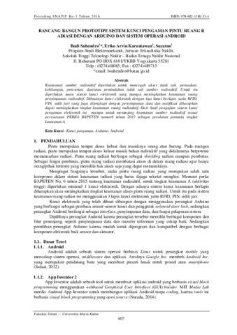 Budi Suhendro, BS and Suyatno, S and Eriko Arvin Karuniawan, EAK RANCANG BANGUN PROTOTIPE SISTEM KUNCI PENGAMAN PINTU RUANG R ADIASI DENGAN ARDUINO DAN SISTEM OPERASI ANDROID. In: S N A T I F K e - 3.