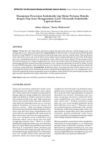 Johan, Adiyasa and Ratna, Meidyawati (0023) Manajemen perawatan endodontik gigi molar pertama maksila dengan pulp stone menggunakan scaler ultrasonik endodontik: laporan kasus. In: Prosiding KPPIKG 2023: The 19th Scientific Meeting and Refresher Coursein Dentistry, Faculty of Dentistry, Universitas Indonesia, 2-4 Februari 2023, Jakarta Convention Center.