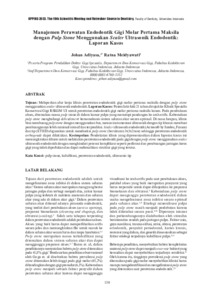 Tujuan: Melaporkan alur kerja klinis perawatan endodontik gigi molar pertama maksila dengan pulp stone menggunakan scaler ultrasonik endodontik. Laporan Kasus: Pasien laki-laki 21 tahun dirujuk ke Klinik Spesialis Konservasi Gigi RSKGM UI untuk perawatan endodontik gigi molar pertama maksila kanan. Pada pembukaan akses, ditemukan massa pulp stone di dalam kamar pulpa yang menutupi pandangan ke arah orifis. Keberadaan pulp stone menghalangi debridement kemomekanis sistem saluran akar secara optimal. Di masa lampau, klinis bisa membuang pulp stone dengan menggunakan bur, namun instumentasi ultrasonik dengan tip khusus membuat pembuangannya lebih minimal invasif dan terprediksi. Scaler ultrasonik endodontik (Acteon® by Satelec, France) dan tip (ET18D) digunakan untuk mendiseksi pulp stone (berukuran 3x3x2mm) sehingga perawatan endodontik orthograde dapat dilakukan. Kesimpulan: Pendekatan klinis yang dipresentasikan dalam laporan kasus ini memungkinkan klinisi untuk melakukan perawatan endodontik pada gigi dengan pulp stone menggunakan scaler ultrasonik endodontik dengan menghindari potensi komplikasi seperti perforasi dan pembuangan jaringan keras gigi yang tidak diperlukan dan dapat melemahkan struktur gigi yang tersisa.