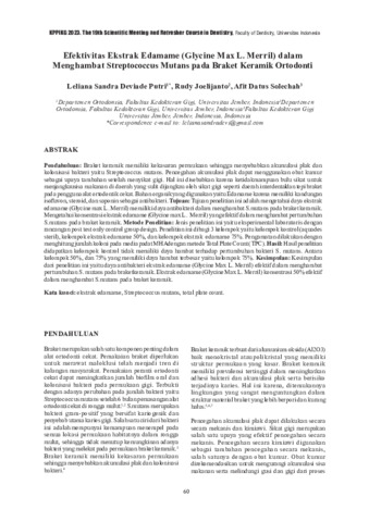 Leliana, Sandra Deviade Putri and Rudy, Joelijanto and Afit, Datus Solechah (2023) Efektivitas ekstrak edamame (Glycine max L. Merril) dalam menghambat Streptococcus mutans pada braket keramik ortodonti. In: Prosiding KPPIKG 2023: The 19th Scientific Meeting and Refresher Coursein Dentistry, Faculty of Dentistry, Universitas Indonesia, 2-4 Februari 2023, Jakarta Convention Center.