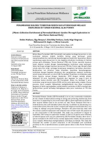 Deden, Mudiana and Elga, Renjana and Elok, Rifqi Firdiana and Linda, Wige Ningrum and Melisnawati, H. Angio and Rony, Irawanto (2020) Penambahan koleksi tumbuhan Kebun Raya Purwodadi melalui eksplorasi di Taman Nasional Alas Purwo. Jurnal Penelitian Kehutanan Wallacea, 9 (2). pp. 83-92. ISSN 2302-299X