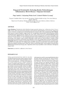 Popy, Sandra and Cahyaning, Wulan Sasri and Liemeivi, Liemeivi and Robert, Lessang (2023) Pengaruh periodontitis terhadap resiko perkembangan inflammatory bowel disease: tinjauan sistematis. In: Prosiding KPPIKG 2023: The 19th Scientific Meeting and Refresher Coursein Dentistry, Faculty of Dentistry, Universitas Indonesia, 2-4 Februari 2023, Jakarta Convention Center.
