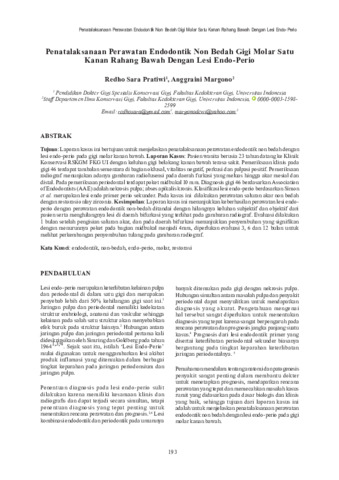 Tujuan: Laporan kasus ini bertujuan untuk menjelaskan penatalaksanaan perawatan endodontik non bedah dengan lesi endo-perio pada gigi molar kanan bawah. Laporan Kasus: Pasien wanita berusia 23 tahun datang ke Klinik Konservasi RSKGM FKG UI dengan keluhan gigi belakang kanan bawah terasa sakit. Pemeriksaan klinis pada gigi 46 terdapat tambalan sementara di bagian oklusal, vitalitas negatif, perkusi dan palpasi positif. Pemeriksaan radiograf menunjukan adanya gambaran radiolusensi pada daerah furkasi yang meluas hingga akar mesial dan distal. Pada pemeriksaan periodontal terdapat poket midbukal 10 mm. Diagnosis gigi 46 berdasarkan Association of Endodontists (AAE) adalah nekrosis pulpa; abses apikalis kronis. Klasifi kasi lesi endo-perio berdasarkan Simon et al. merupakan lesi endo primer perio sekunder. Pada kasus ini dilakukan perawatan saluran akar non bedah dengan restorasi onlay zirconia. Kesimpulan: Laporan kasus ini menunjukkan keberhasilan perawatan lesi endoperio denganperawatan endodontik non-bedah ditandai dengan hilangnya keluhan subjektif dan objektif dari pasien serta menghilangnya lesi didaerah bifurkasi yang terlihat pada gambaran radiograf. Evaluasi dilakukan 1bu lan setelah pengisian saluran akar, dan pada daerah bifurkasi menunjukkan penyembuhan yang signifikan dengan menurunnya poket pada bagian midbukal menjadi 4mm, diperlukan evaluasi 3,6 dan 12 bulan untuk melihat perkembangan penyembuhan tulang pada gambaran radiograf.