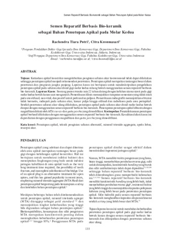 Rachendra, Tiara Putri and Citra, Kusumasari (2023) Semen reparatif berbasis bio-keramik sebagai bahan penutupan apikal pada molar kedua. In: Prosiding KPPIKG 2023: The 19th Scientific Meeting and Refresher Coursein Dentistry, Faculty of Dentistry, Universitas Indonesia, 2-4 Februari 2023, Jakarta Convention Center.