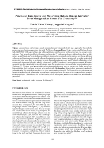 Valeria, Widita Wairooy and Anggraini, Margono (2023) Perawatan endodontik gigi molar dua maksila dengan kurvatur berat menggunakan sistem file trunatomy™. In: Prosiding KPPIKG 2023: The 19th Scientific Meeting and Refresher Coursein Dentistry, Faculty of Dentistry, Universitas Indonesia, 2-4 Februari 2023, Jakarta Convention Center.