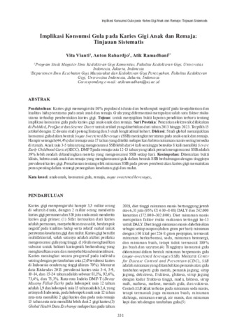 Vita, Vianti and Anton, Rahardjo and Atik, Ramadhani (2023) Implikasi konsumsi gula pada karies gigi anak dan remaja: tinjauan sistematis. In: Prosiding KPPIKG 2023: The 19th Scientific Meeting and Refresher Coursein Dentistry, Faculty of Dentistry, Universitas Indonesia, 2-4 Februari 2023, Jakarta Convention Center.