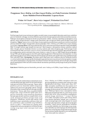 Wulan, Sri Utami and Haru, Setyo Anggani and Wulandani, Liza Putri (2023) Penggunaan nance holding arch dan lingual holding arch pada perawatan ortodonti kasus maloklusi protrusi bimaksilar: laporan kasus. In: Prosiding KPPIKG 2023: The 19th Scientific Meeting and Refresher Coursein Dentistry, Faculty of Dentistry, Universitas Indonesia, 2-4 Februari 2023, Jakarta Convention Center.