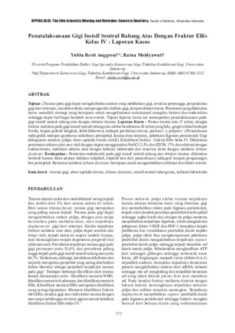 Yulita, Resti Anggreni and Ratna, Meidyawati (2023) Penatalaksanaan gigi insisif sentral rahang atas dengan fraktur ellis kelas IV : laporan kasus. In: Prosiding KPPIKG 2023: The 19th Scientific Meeting and Refresher Coursein Dentistry, Faculty of Dentistry, Universitas Indonesia, 2-4 Februari 2023, Jakarta Convention Center.