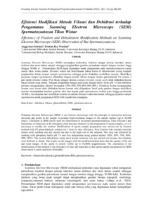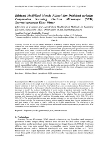 Scanning Electron Microscope (SEM) merupakan mikroskop elektron dengan prinsip interaksi antara elektron dan atom dalam sampel sehingga menghasilkan gambar permukaan sampel dengan resolusi tinggi (hingga 30.000 x). Pemanfaatan SEM dapat digunakan untuk pengamatan pada spermatozoatozoa cairan semen tikus wistar jantan. Efisiensi waktu dan keterbatasan bahan kimia di laboratorium sering menjadi penghambat dalam prepasi sampel spermatozoa sehingga perlu dilakukan modifikasi metode. Modifikasi preparasi sampel spermatozoa dilakukan dengan metode fiksasi dengan larutan glutaraldehid 3% selama 1 jam untuk efisiensi waktu. Post fiksasi dengan larutan osmium tetroxide (osmic acid) tidak dilakukan karena harga larutan yang mahal. Tahapan dilanjutkan dengan pencucian dengan buffer fosfat pH 7,4 dan dehidrasi pertama menggunakan alkohol bertingkat (30%, 50%, 70%, 80%, 90%, 96%). Dehidrasi kedua menggunakan larutan amyl asetat tidak dilakukan karena larutan sulit didapatkan. Hasil pada gambar dengan modifikasi metode menunjukkan kualitas gambar ekor dan kepala pada spermatozoa terlihat jelas hingga perbesaran 18.000 x. Kesimpulan dari modifikasi metode ini adalah efisiensi waktu dan bahan sehingga preparasi sampel spermatozoa untuk pengamatan SEM lebih mudah dan terjangkau.