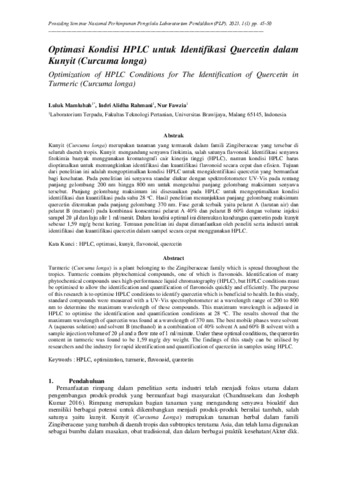 Luluk, Mamluhah and Indri, Alidha Rahmani and Nur, Fawzia (2023) Optimasi kondisi HPLC untuk identifikasi quercetin dalam kunyit (Curcuma longa). In: Prosiding Seminar Nasional Perhimpunan Pengelola Laboratorium Pendidikan Indonesia Volume 1, No. 1, 24-26 Agustus 2023, Hotel Atria Malang.