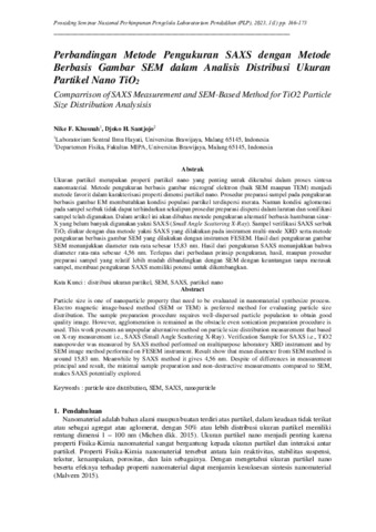 Ukuran partikel merupakan properti partikel nano yang penting untuk diketahui dalam proses sintesa nanomaterial. Metode pengukuran berbasis gambar micrograf elektron (baik SEM maupun TEM) menjadi metode favorit dalam karakterisasi properti dimensi partikel nano. Prosedur preparasi sampel pada pengukuran berbasis gambar EM membutuhkan kondisi populasi partikel terdispersi merata. Namun kondisi aglomerasi pada sampel serbuk tidak dapat terhindarkan sekalipun prosedur preparasi dispersi dalam larutan dan sonifikasi sampel telah digunakan. Dalam artikel ini akan dibahas metode pengukuran alternatif berbasis hamburan sinar X yang belum banyak digunakan yakni SAXS (Small Angle Scattering X-Ray). Sampel verifikasi SAXS serbuk TiO2 diukur dengan dua metode yakni SAXS yang dilakukan pada instrumen multi-mode XRD serta metode pengukuran berbasis gambar SEM yang dilakukan dengan instrumen FESEM. Hasil dari pengukuran gambar SEM menunjukkan diameter rata-rata sebesar 15,83 nm. Hasil dari pengukuran SAXS menunjukkan bahwa diameter rata-rata sebesar 4,56 nm. Terlepas dari perbedaan prinsip pengukuran, hasil, maupun prosedur preparasi sampel yang relatif lebih mudah dibandingkan dengan SEM dengan keuntungan tanpa merusak sampel, membuat pengukuran SAXS memiliki potensi untuk dikembangkan.