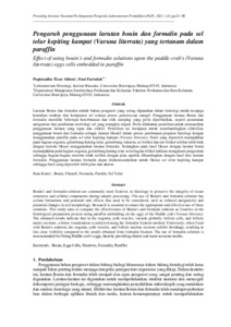 Larutan Bouin dan formalin adalah bahan pengawet yang sering digunakan dalam histologi untuk menjaga keutuhan struktur dan komponen sel selama proses pemrosesan sampel. Penggunaan larutan Bouin dan formalin memiliki beberapa keterbatasan dan efek samping yang perlu diperhatikan, seperti penurunan antigenitas dan perubahan morfologi sel yang mungkin terjadi. Perlu dilakukan penelitian untuk memastikan penggunaan larutan yang tepat dan efektif. Penelitian ini bertujuan untuk membandingkan efektifitas penggunaan bouin dan formalin sebagai larutan fiksatif dalam proses pembuatan preparat histologi dengan menggunakan paraffin pada sel telur kepiting kampat (Varuna litterata). Hasil yang diperoleh menujukkan pada bagian oogonia, gelembung kuning telur, gelembung vakuola, sel folikel dan inti folikel terlihat lebih baik dengan metode fiksasi menggunakan larutan formalin. Sedangkan pada hasil fiksasi dengan larutan bouin menunjukkan pada bagian oogonia, gelembung kuning telur serta bagian folikel nukleus mengalami pengerutan sehingga bagian-bagian tersebut tidak terlihat dengan jelas apabila dibandingkan dengan hasil dari larutan formalin. Penggunaan larutan formalin dapat direkomendasikan untuk fiksasi sel telur kepiting kampat sehingga hasil yang diperoleh lebih jelas dan akurat.