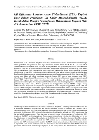 Putjha, Melati and Yenni, Putri Sari and Yulita, Gumala Sari and Elvira, Yunita (2023) Uji efektivitas larutan asam tiobarbiturat (TBA) expired date dalam praktikum uji kadar malondialdehid (MDA) darah dalam rangka pemanfaatan bahan kimia expired date di laboratorium FKIK UNIB. In: Prosiding Seminar Nasional Perhimpunan Pengelola Laboratorium Pendidikan Indonesia Volume 1, No. 1, 24-26 Agustus 2023, Hotel Atria Malang.