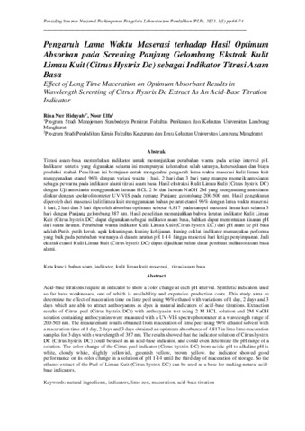 Rina, Nur Hidayah and Noor, Elfa (2023) Pengaruh lama waktu maserasi terhadap hasil optimum absorban pada screning panjang gelombang ekstrak kulit limau kuit (Citrus hystrix Dc) sebagai indikator titrasi asam basa. In: Prosiding Seminar Nasional Perhimpunan Pengelola Laboratorium Pendidikan Indonesia Volume 1, No. 1, 24-26 Agustus 2023, Hotel Atria Malang.