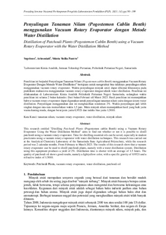 Supriono, Supriono and Ariusmiati, Ariusmiati and Shinta, Sisilia Paurru (2023) Penyulingan tanaman nilam (Pogostemon cablin benth) menggunakan Vacuum Rotary Evaporator dengan Metode Water Distillation. In: Prosiding Seminar Nasional Perhimpunan Pengelola Laboratorium Pendidikan Indonesia Volume 1, No. 1, 24-26 Agustus 2023, Hotel Atria Malang.
