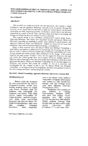This research was conducted in II B class hell Mojokerto. The research is simply proposed to raise the Aggressive Behaviour and self esteem of criminal. Through this research, we are hoped and recommended to apply the mental (moral and spiritual) counselling into their integral programme. Furthermore, mental (moral and spiritual) counselling is a guide of moral values and mass 'ethics focussing on developing self motivation will develop their live normally in social community. This research design is true experiment, pretest-posttest control group design. Aggressive Behaviour, Self esteem were dependent variable and Mental (Moral and Spiritual) Counselling as independent variable. Data collected by questionnaires with Aggressive Behaviour Scale. and Self-Esteem . Sample are chozen by two stage total population. Data analyzed with distribution frequency, crosstabulation. Result of these research shows that Mental (Moral and Spiritual) Counselling is good. Before intervention is administered to both groups, the two groups has the same pre-test result, 6 subject (23%) has medium Agresif behaviour and medium self esteem of study groups and control groups. After intervention on the change of the posttest result for the study groups, 4 subject ( 15%) has low Aggressive behaviour and high self esteem. For control groups show that 6 subject (23%) has medium Aggressive behaviour and medium self esteem. The result of distribution frequency above have been indicating that mental (Moral and Spiritual) Counselling can be decrease Aggressive Behaviour and increase Self esteem the criminal. So that it is necessary and recommended for the criminal of hell to give the Mental (Moral and Spiritual) Counselling , as an integral part of the programmes that have been planned by hell, in the way to change motivation and encourage the criminal.