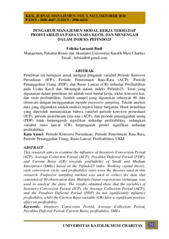 Felisita, Larasati Budi (2024) Pengaruh manajemen modal kerja terhadap profitabilitas pada usaha kecil dan menengah dalam indeks Pefindo25. Konsumen & Konsumsi: Jurnal Manajemen, 3 (3): 3. pp. 757-772. ISSN 2808-4667
