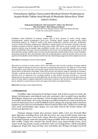 Endang, Ayu Susilawati and Nur, Syamsiyah and Yahya, Yahya and Eva, Novianti and Eka, Yuni Astuty and Mira, Febriana Sesunan (2024) Pemanfaatan aplikasi Canva untuk membuat konten pembelajaran kepada majlis taklim anak Masjid Al Mujahidin Kebon Baru Tebet Jakarta Selatan. Jurnal Pengabdian Teknologi, Ekonomi dan Humaniora: JEPTIRA, 2 (1): 1. pp. 1-5. ISSN 3031-5956