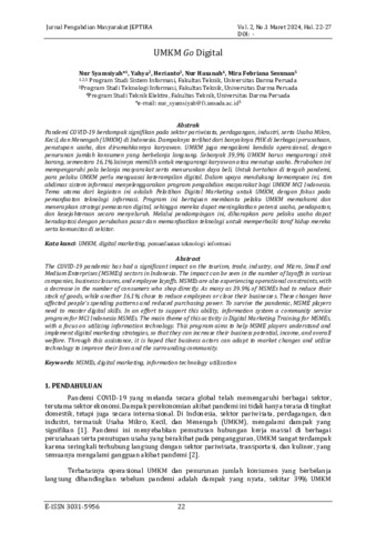 Nur, Syamsiyah and Yahya, Yahya and Herianto, Herianto and Nur, Hasanah and Mira, Febriana Sesunan (2024) UMKM go digital. Jurnal Pengabdian Teknologi, Ekonomi dan Humaniora: JEPTIRA, 2 (1): 5. pp. 22-27. ISSN 3031-5956