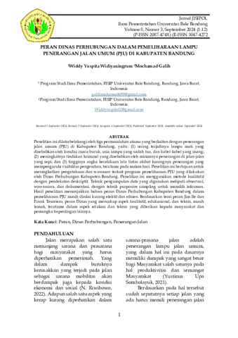 Widdy, Yuspita Widiyaningrum and Mochamad, Galih (2024) Peran Dinas Perhubungan dalam pemeliharaan lampu Penerangan Jalan Umum (PJU) di Kabupaten Bandung. Jurnal Ilmu Sosial dan Ilmu Politik, 8 (3): 1. pp. 1-12. ISSN 2087-474X