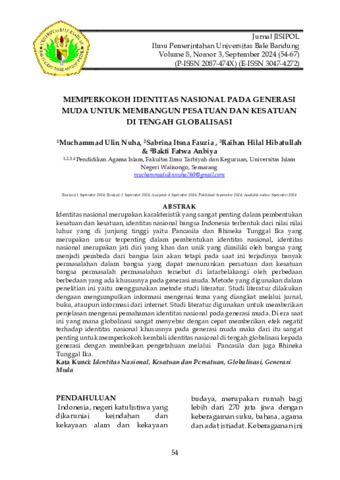 Muchammad, Ulin Nuha and Sabrina, Itsna Fauzia and Raihan, Hilal Hibatullah and Bakti, Fatwa Anbiya (2024) Memperkokoh identitas nasional pada generasi muda untuk membangun pesatuan dan kesatuan di tengah globalisasi. Jurnal Ilmu Sosial dan Ilmu Politik, 8 (3): 4. pp. 54-67. ISSN 2087-474X