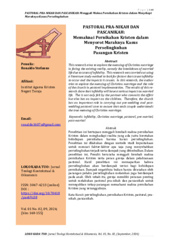 Ronaldo, Stefanus (2024) Pastoral pra-nikah dan pascanikah: Menggali makna pernikahan Kristen dalam menyikapi maraknya kasus perselingkuhan. LOKO KADA TUO: Jurnal Teologi Kontekstual dan Oikumenis, 1 (2): 5. pp. 148-155. ISSN 3047-4213