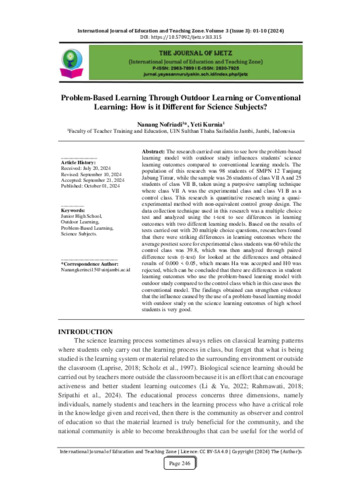 Nanang, Nofriadi and Yeti, Kurnia (2024) Problem-based learning through outdoor learning or conventional learning: How is it different for science subjects? International Journal of Education and Teaching Zone, 3 (3): 2. pp. 246-259. ISSN 2963-7899
