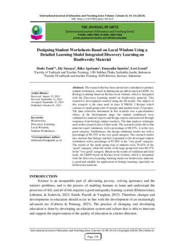 Dodo, Tomi and Ely, Suraya and Riko, Aprianto and Emayulia, Sastria and Lovi, Leoni (2024) Designing student worksheets based on local wisdom using a detailed learning model integrated discovery learning on biodiversity material. International Journal of Education and Teaching Zone, 3 (3): 4. pp. 278-290. ISSN 2963-7899