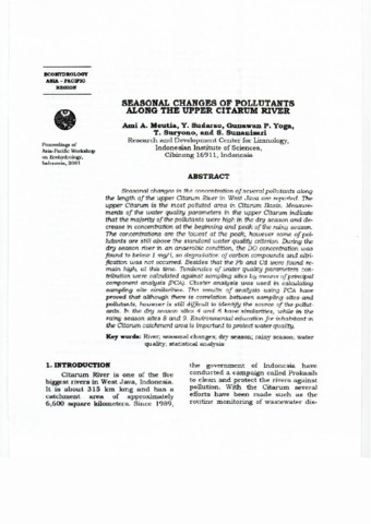 Ami, A. Meutia and Yoyok, Sudarso and Gunawan, Pratama Yoga and Tri, Suryono and Senny, Sunanisari (2001) Seasonal changes of pollutants along the upper Citarum River. In: Proceedings Asia-Pacific Workshop on Ecohydrology, 20-22 Maret 2001, Museum Zoologi Cibinong.