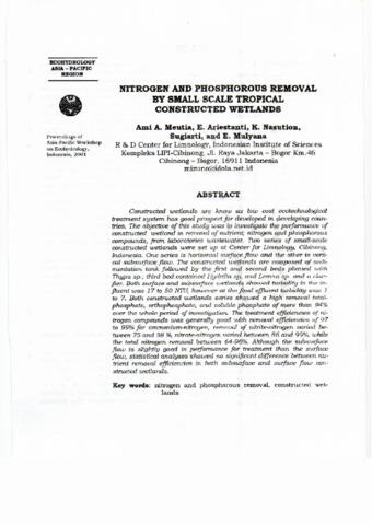 Ami, A. Meutia and E., Ariestanti and K., Nasution and Sugiarti, Sugiarti and Endang, Mulyana (2001) Nitrogen and phosphorous removal by small scale tropical constructed wetlands. In: Proceedings Asia-Pacific Workshop on Ecohydrology, 20-22 Maret 2001, Museum Zoologi Cibinong.