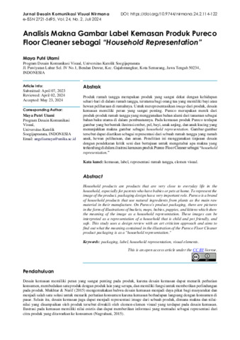 Maya, Putri Utami (2024) Analisis makna gambar label kemasan produk pureco floor cleaner sebagai “household representation”. Jurnal Desain Komunikasi Visual Nirmana, 24 (2): 4. pp. 114-122. ISSN 2721-5695