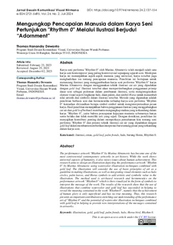 Thomas, Hanandry Dewanto (2024) Mengungkap pencapaian manusia dalam karya seni pertunjukan "Rhythm 0" melalui ilustrasi berjudul “Adornment”. Jurnal Desain Komunikasi Visual Nirmana, 24 (2): 6. pp. 137-154. ISSN 2721-5695