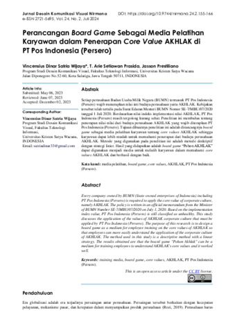 Vincensius, Dinar Satria Wijaya and T., Arie Setiawan Prasida and Jasson, Prestiliano (2024) Perancangan board game sebagai media pelatihan karyawan dalam penerapan core value AKHLAK di PT Pos Indonesia (Persero). Jurnal Desain Komunikasi Visual Nirmana, 24 (2): 7. pp. 155-166. ISSN 2721-5695