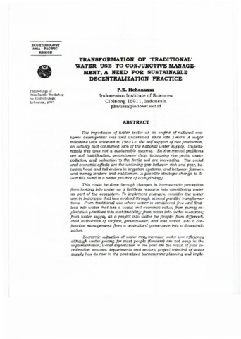 P., E. Hehanussa (2001) Transformation of ‘traditional’ water use to conjunctive management, a need for sustainable decentralization practice. In: Proceedings Asia-Pacific Workshop on Ecohydrology, 20-22 Maret 2001, Museum Zoologi Cibinong.
