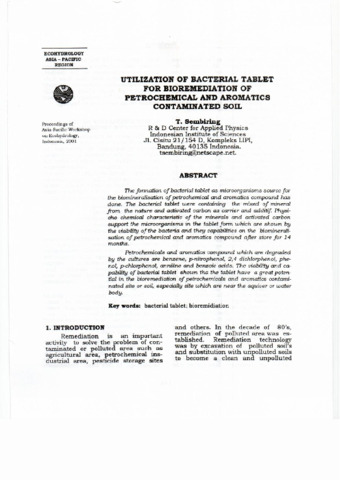 T., Sembiring (2001) Utilization of bacterial tablet for bioremediation of petrochemical and aromatics contaminated soil. In: Proceedings Asia-Pacific Workshop on Ecohydrology, 20-22 Maret 2001, Museum Zoologi Cibinong.