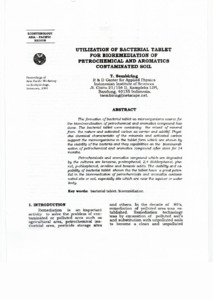 The formation of bacterial tablet as microorganisms source for the biomineralisation of petrochemical and aromatics compound has done. The bacterial tablet were containing the mixed of mineral from the nature and activated carbon as carrier and additif. Phgsicho chemical characteristic of the minerals and activated carbon support the microorganisms in the tablet form which are shoun by the viability of the bacteria and they capabilities on the biomineralisation of petrochemical and aromatics compound after store for 14 months.Petrochemicals and aromatics compound which are degradedby the cultures are benzene, p-nitrophenol, 2,4 dichlorphenol, phe nol, p-chlorphenol, anniline and benzoic acids. The viability and capability of bacterial tablet shown tha the tablet have a great potential in the bioremediation of petrochemicals and aromatics contaminated site or soil, especially site which are near the aquiver or water body.