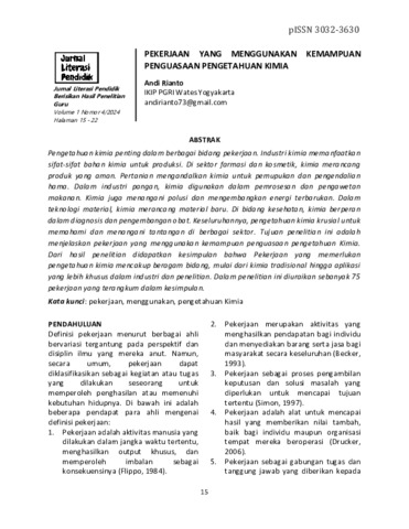 Andi, Rianto (2024) Pekerjaan yang menggunakan kemampuan penguasaan pengetahuan kimia. Literasi Pendidik: Jurnal Literasi Pendidik Berisikan Hasil Penelitian Guru, 1 (4): 3. pp. 15-22. ISSN 3032-3630