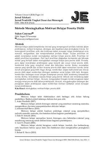 Suhas, Caryono (2024) Metode meningkatkan motivasi belajar peserta didik. Jurnal Edukasi: Jurnal Pendidik Tingkat Dasar dan Menengah, 1 (4): 1. pp. 1-6. ISSN 3046-5834