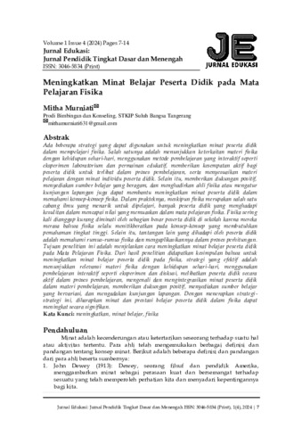 Mitha, Murniati (2024) Meningkatkan minat belajar peserta didik pada mata pelajaran fisika. Jurnal Edukasi: Jurnal Pendidik Tingkat Dasar dan Menengah, 1 (4): 2. pp. 7-14. ISSN 3046-5834